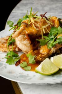 Crispy fried Ocean Jacket, tamarind, yellow bean, ginger, coriander, shallot