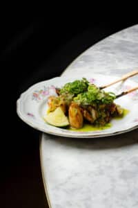 Port Lincoln baby squid skewer, seafood sauce, spring onion, white pepper, lime